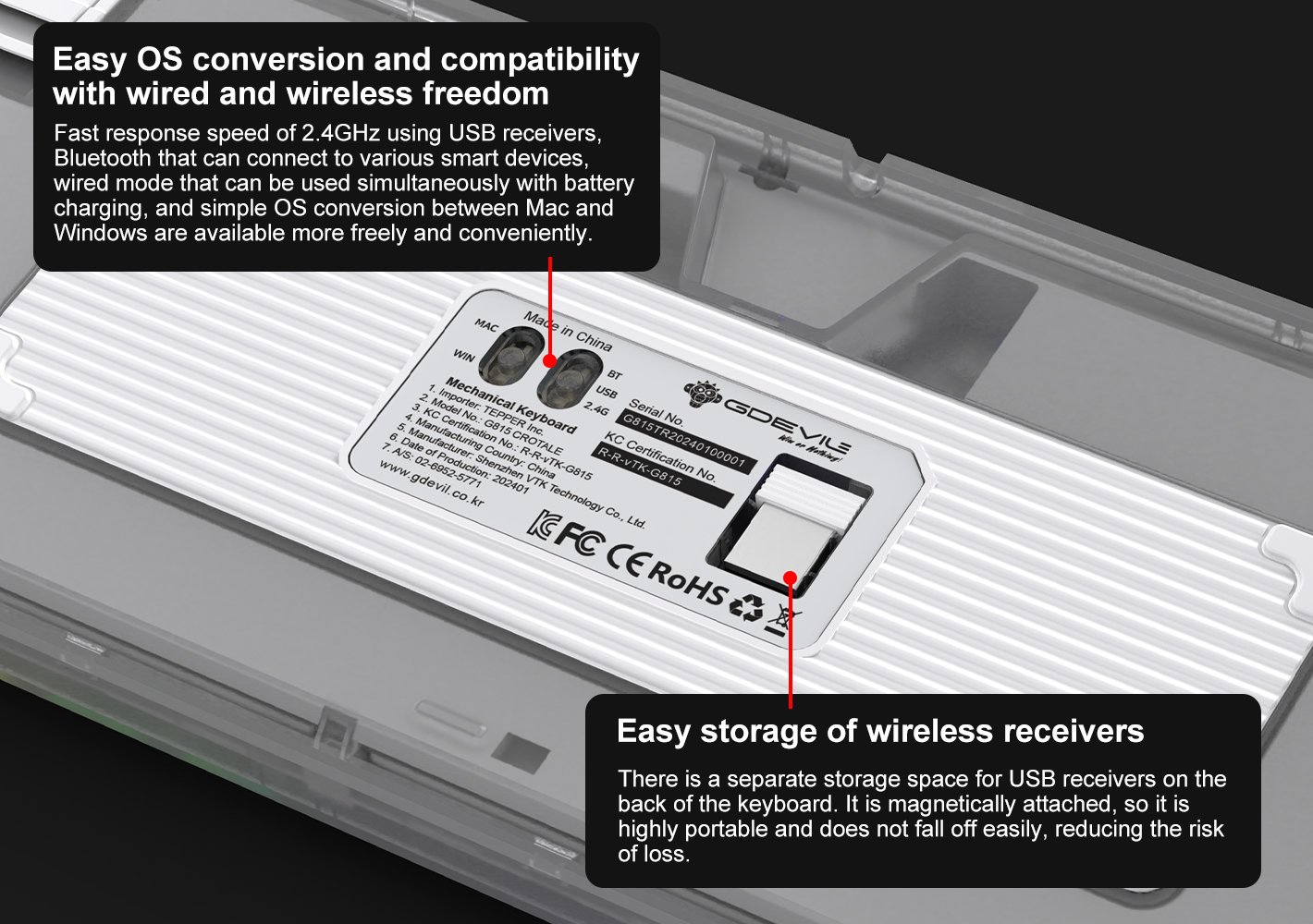 Fast response speed of 2.4GHz using USB receivers, Bluetooth that can connect to various smart devices, wired mode that can be used simultaneously with battery charging, and simple OS conversion between Mac and Windows are available more freely and conveniently.