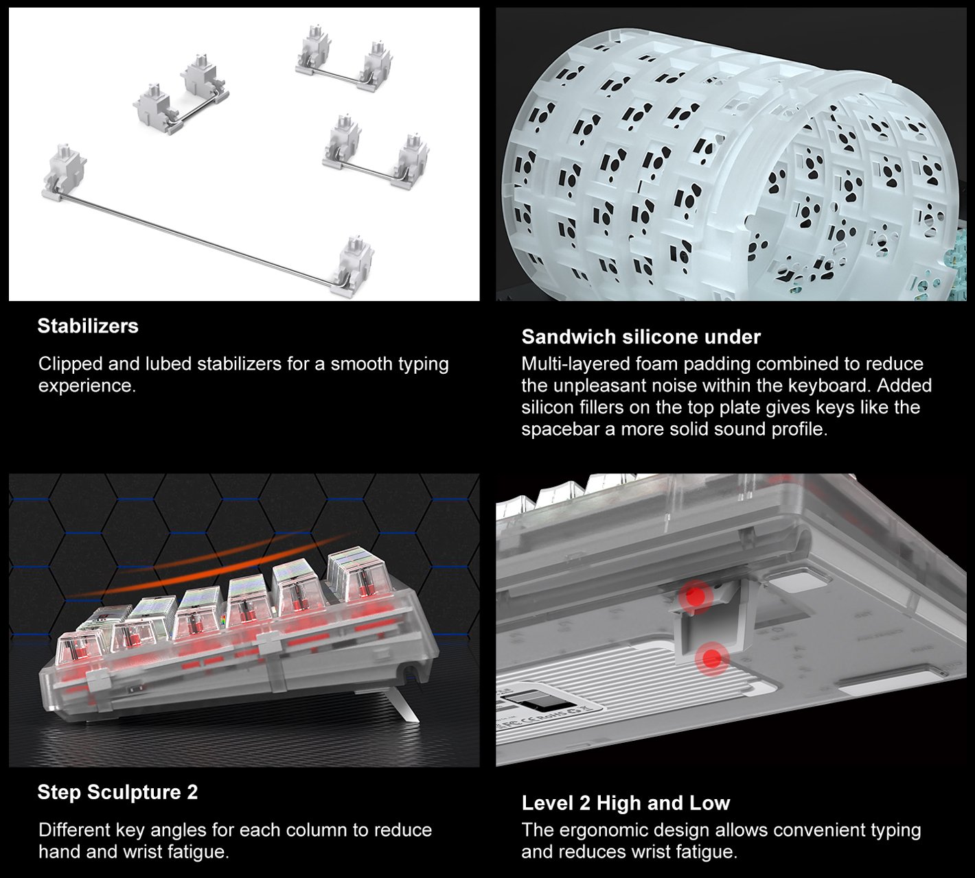 It is equipped with a silicone gasket mount and an EVA sound-absorbing pad to minimize wailing and keyboard noise for a higher gaming and work environment.