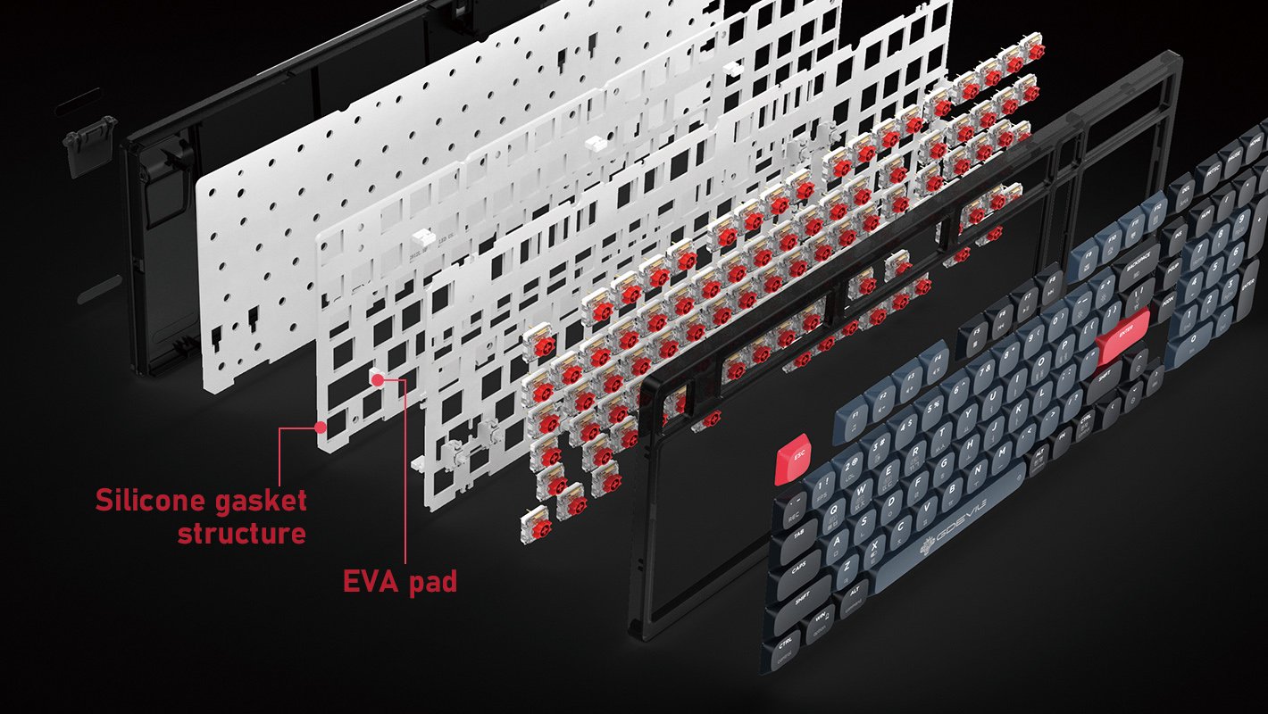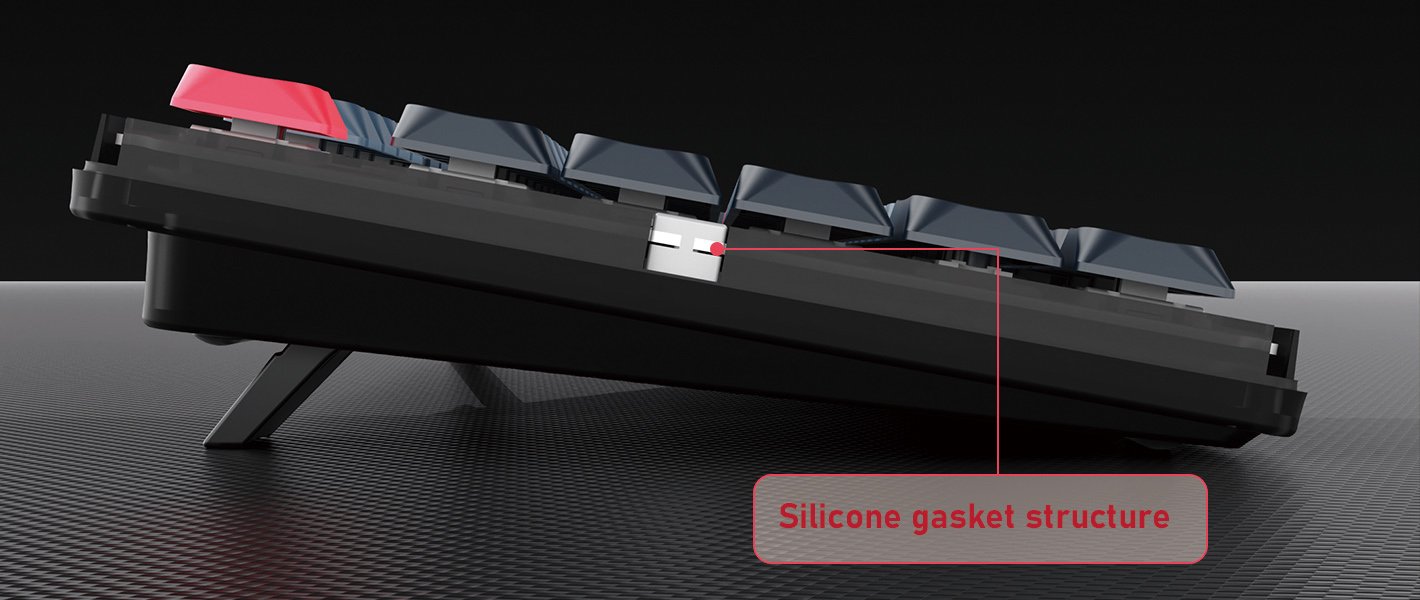 A gasket mount structure made with a silicone sound-absorbing pad between the reinforcement plate and the housing for neat typing effectively reduces sound and noise.