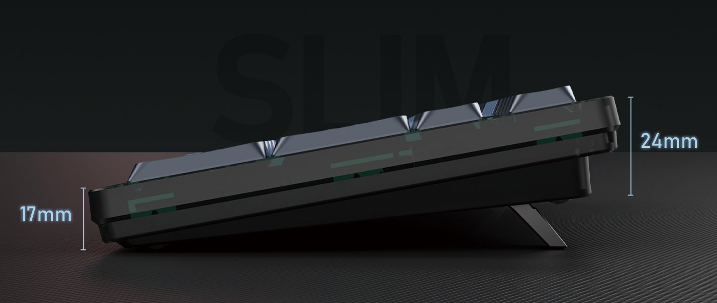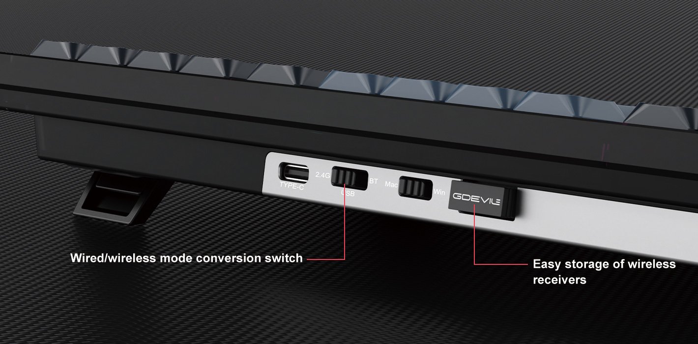 You can conveniently switch the wired and wireless connection mode at the top of the keyboard, and it is a storage space where you can put a wireless receiver, so you can carry it without worrying about loss.