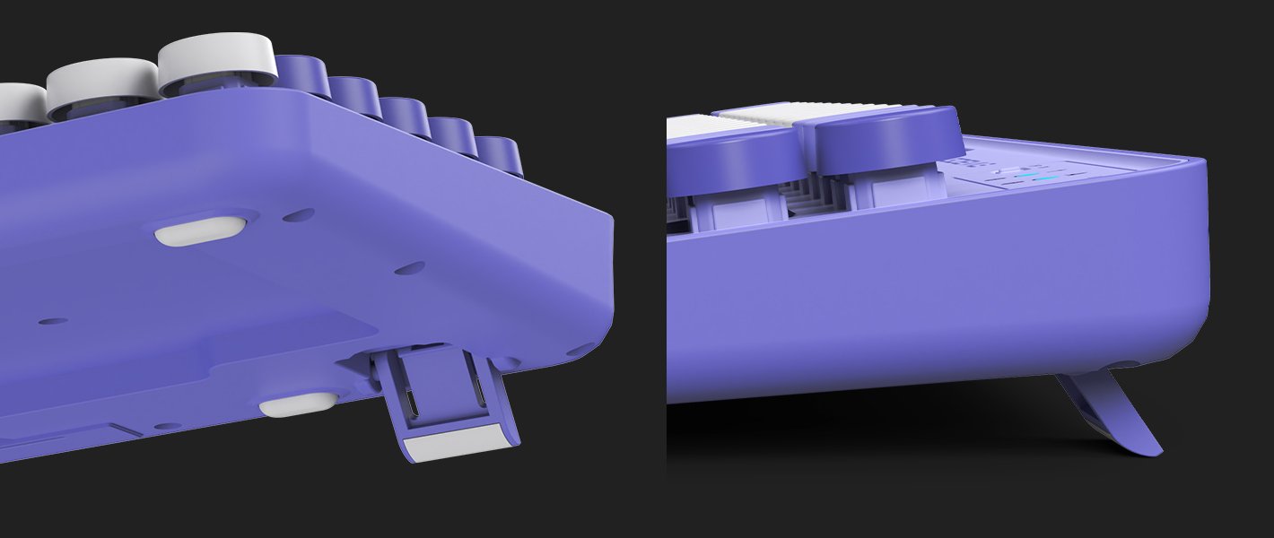 At the bottom of the keyboard, a non-slip pad for stabilized typing without sliding when in use and a height pedestal adjustable to the user's environment are applied.